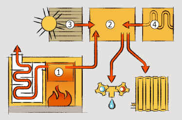 Tradition & High-Tech: Sie können die klassische Wärme Ihres Kachelofens mit anderen, modernen Formen des Heizens kombinieren. Es gibt viele Möglichkeiten. Hier ein Beispiel, wie Sie Solarenergie und Erdwärme ins Spiel bringen können: Der Wärmetauscher (1) leitet einen Teil der Wärme des Kachelofens in den Pufferspeicher (2). Sonnenkollektor (3) und Wärmepumpe (4) tragen das ihre bei und sorgen in Kombination für eine ausgeglichene Energiebilanz.